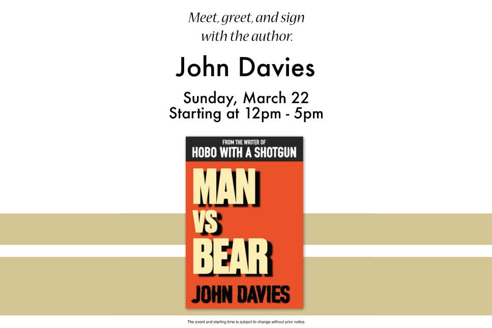 Meet John Davies, author of the adventure memoir Man vs Bear, at a special book signing at Coles at Eglinton Square. Davies’ book recounts a remarkable true story of survival in the Canadian wilderness after a life-threatening encounter with a bear. Blending suspense, resilience, and firsthand experience in the outdoors, Man vs Bear offers a gripping look at the realities of nature and the strength of the human spirit.